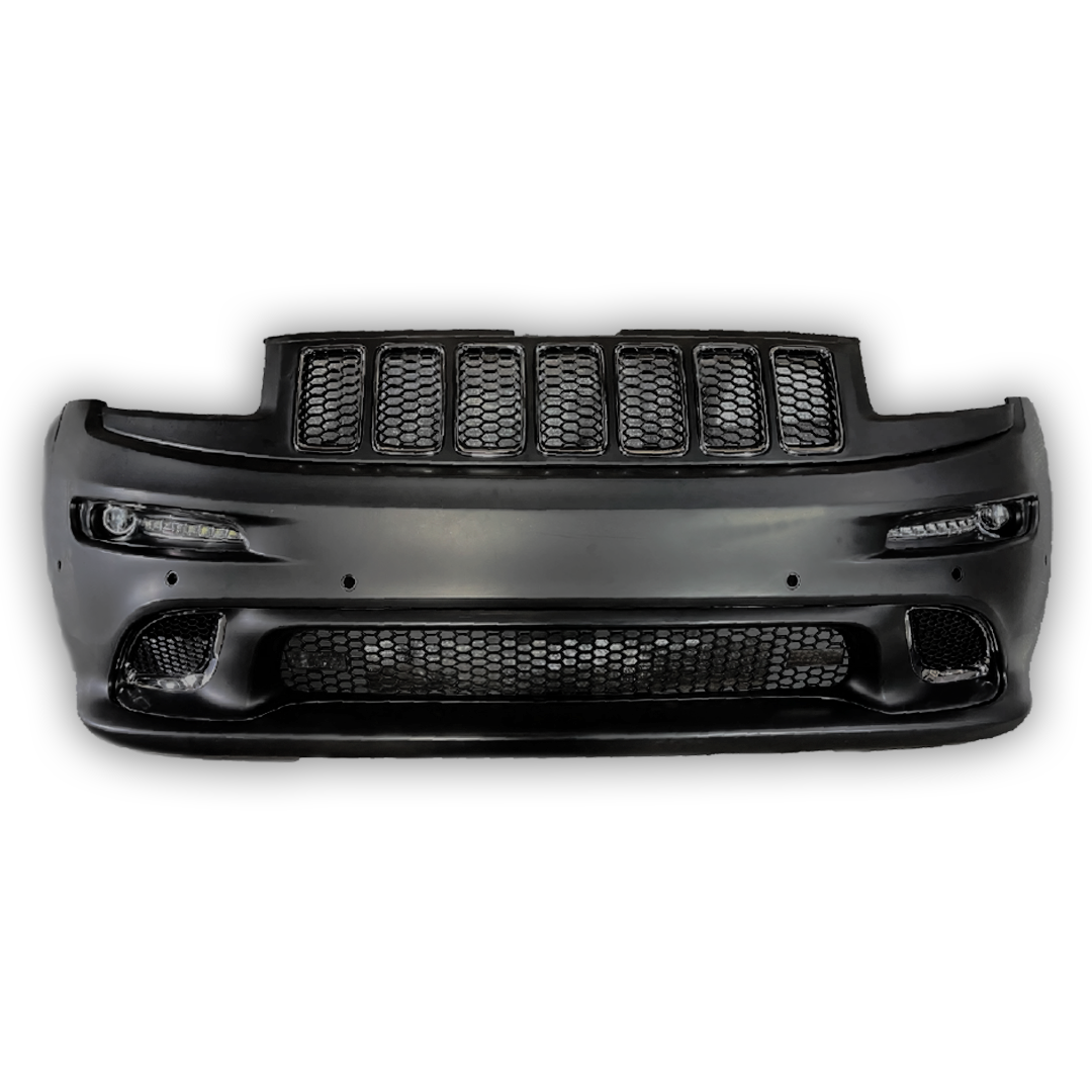 Jeep grand cherokee srt front bumper, comes complete with the grill and fog lights. OEM fitment, compatible with 2014 to 2016 Jeep Grand Cherokee